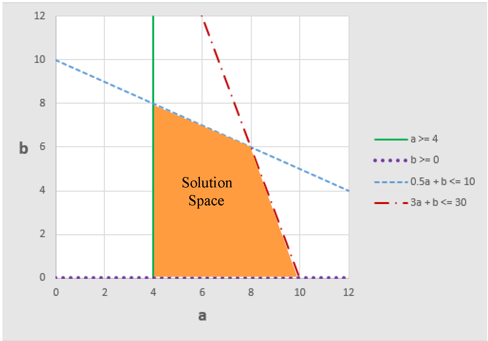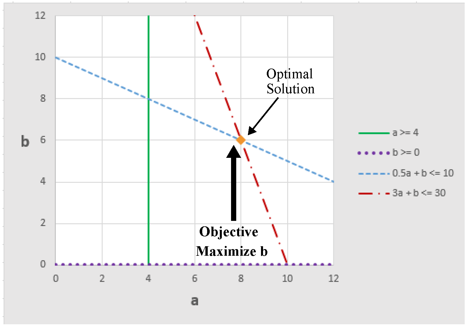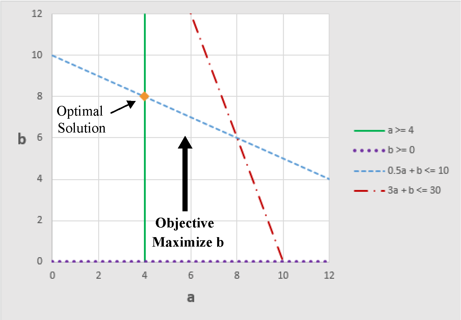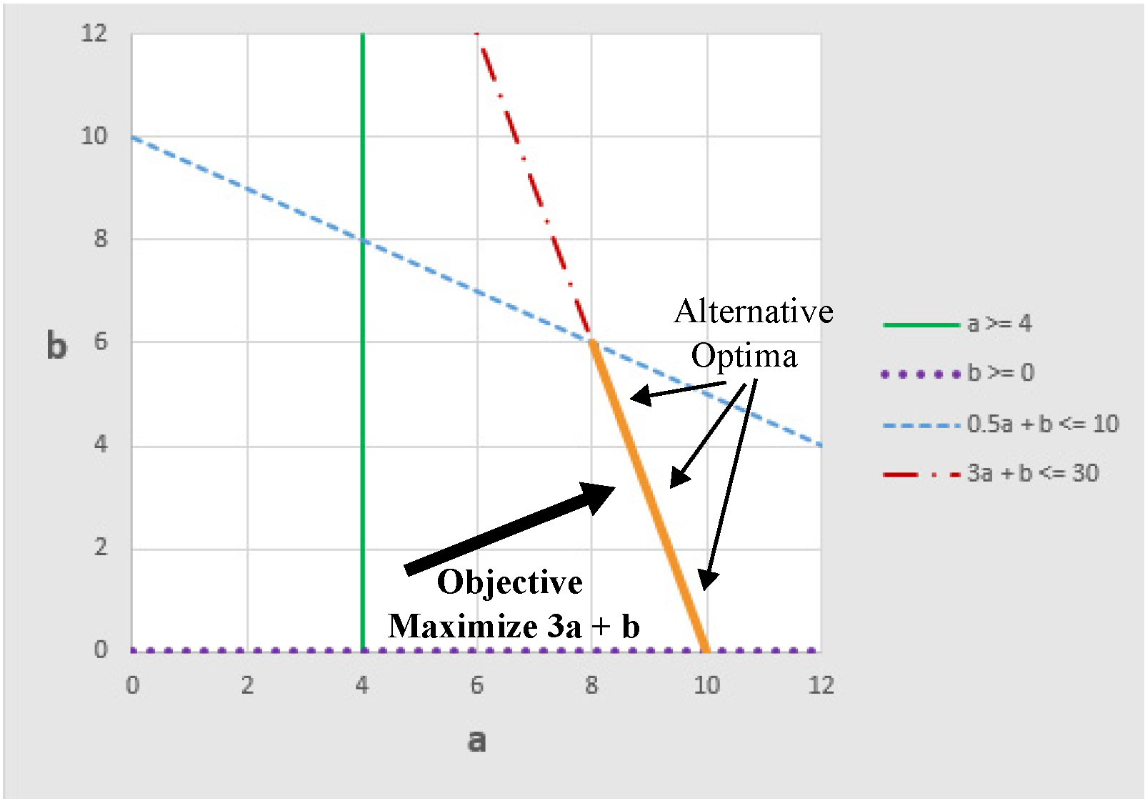 The figure above shows the direction that the objective is pushing the solution. In this case, there are many possible solutions that will equally maximize the objective. Another way to state this is that there are alternative optima. Any point that is on the line 3a + b = 30 with a between 8 and 10 (equivalently, b between 0 and 6) satisfies all constraints and equally maximizes the objective. The alternative optima are illustrated by the orange line segment in the figure above. Given the current set of constraints and objectives we have included in the problem (we have not yet added Objective 2), there is no preference for one point over another from this set of alternative optima. If we increase a, then we must decrease b, but in all cases the objective value, z1, is 30. The simplex method for solving linear programs tends to generate extreme point solutions. In this case it would generate a solution at one of the end points of the line segment.