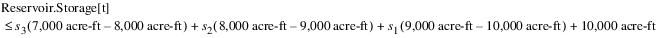 In water resource management policies, it is common to have constraints at different priorities that have the same form (same left-hand-side) and differ only in the right-hand-side constraint value. For example, assume that a reservoir Storage variable has a formal upper bound of 10,000 acre-ft. In the policy constraints, there is a high priority Maximum Storage constraint to not exceed 9,000 acre-ft. At a lower priority there is a Target Operating Range constraint that applies a more restrictive max Storage of 8,000 acre-ft. Typically it is desirable to be below this elevation, but it might not always be possible due to high inflows. Then at a lower priority there is a Target Operating Storage Point constraint that constrains the Storage equal to 7,000 acre-ft, if possible.