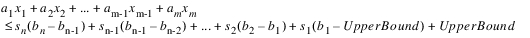 where each xm is a variable in the LHS of each of the constraints in the shrinking sequence, each am is the corresponding coefficient on the variable, each sn is the satisfaction variable associated with the constraint at the nth priority that contains a constraint with this common LHS, and each bn is the right-hand-side constraint value at the nth priority that contains a constraint with this LHS. UpperBound is the formal upper bound on the LHS. It is calculated by evaluating the LHS with each variable with a positive coefficient replaced by the variable’s upper bound and each variable with a negative coefficient replaced by the variable’s lower bound. For variables that correspond directly to a slot, the variable bounds are taken directly from the Upper and Lower Bounds set in the slot configuration. See Variable Bounds for details.