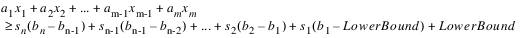 The form is the same for a “greater-than-or-equal-to constraint”, except that the LowerBound is used. The LowerBound is calculated by evaluating the LHS with each variable with a positive coefficient replaced by the variable’s lower bound and each variable with a negative coefficient replaced by the variable’s upper bound.