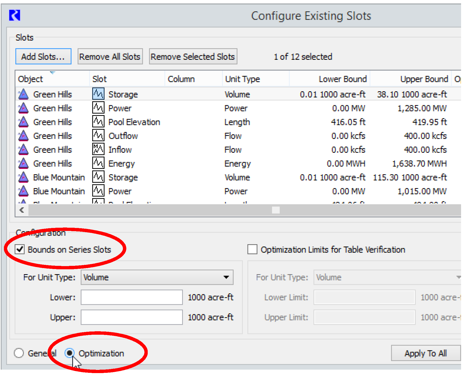 It is important that slot bounds not be confused with policy constraints, nor be used to apply policy constraints. For example, a hydro plant might have a minimum generation requirement that it must meet, but the Power slot Lower Bound should still be zero. The minimum generation requirement would be set through a constraint in the optimization goal set. The slot bounds become hard constraints in the optimization problem and essentially remain constant in the model, whereas policy constraint values (usually stored in custom slots) are typically incorporated as soft constraints and may change for different runs.