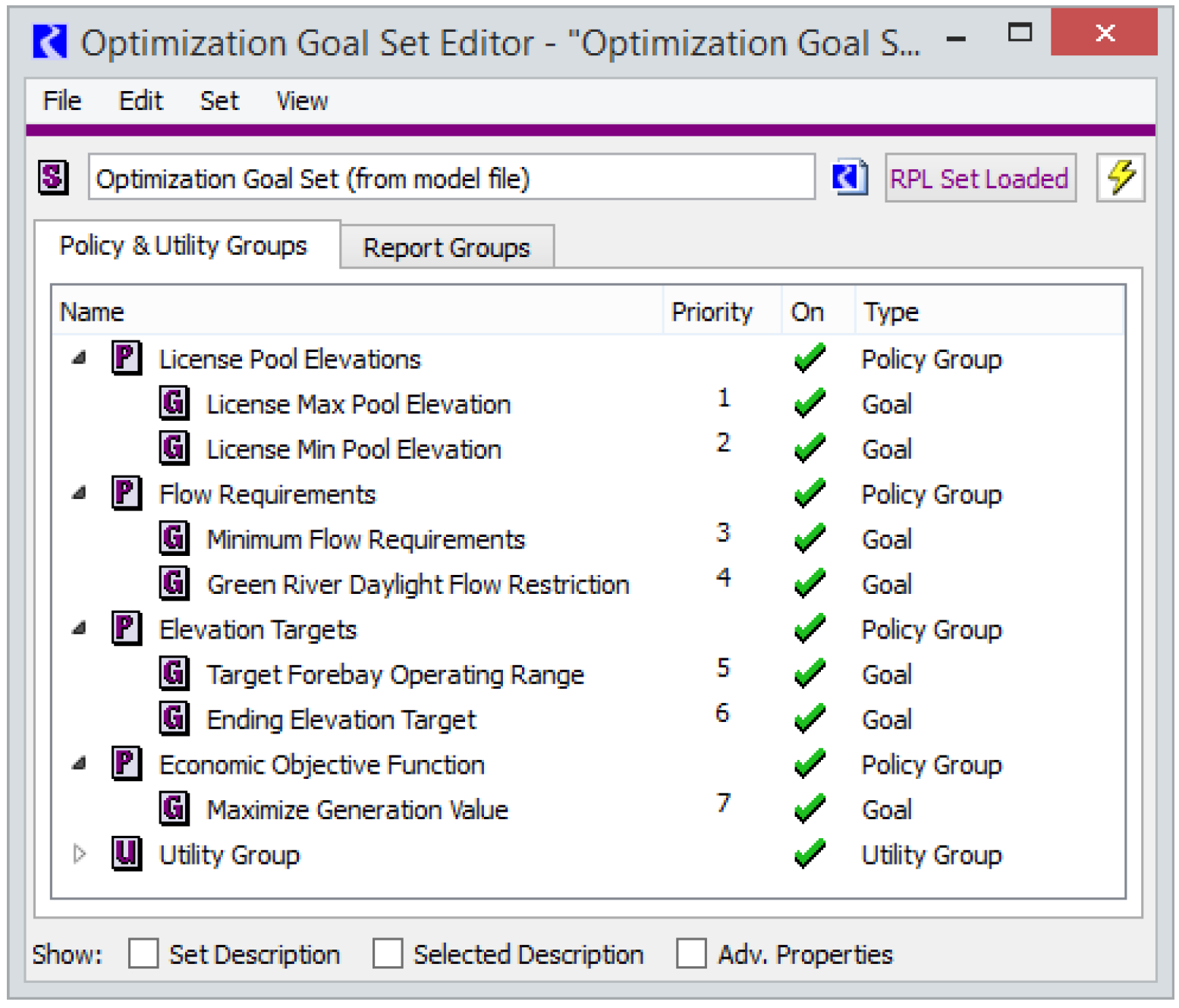 A single goal can contain constraints for multiple objects, but it is generally recommended that a single goal correspond to a single operating policy. For example, the highest priority goal might contain the license maximum Pool Elevation constraints for all reservoirs at all timesteps. The second goal might contain the license minimum Pool Elevation constraints for all reservoirs at all timesteps. This is generally better practice than placing the minimum and maximum elevation constraints in the same goal or placing the minimum elevation constraint in the same goal (same priority) as a minimum flow constraint. When multiple policies are combined in a single goal, it is not always obvious how the policies will trade off with one another if it is not possible to satisfy all constraints at that priority.