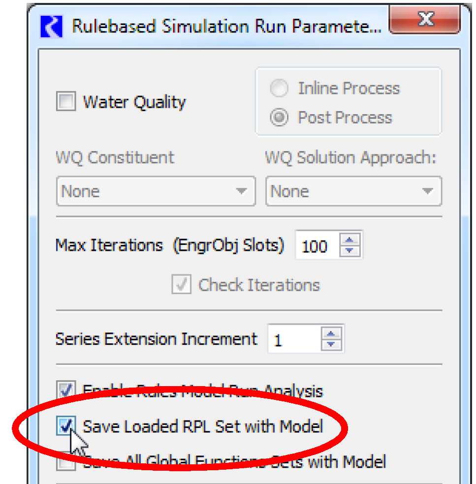 Once a custom Post-optimization Ruleset has been created, it can be saved as a separate file just like a standard RBS Ruleset by selecting File, then Save RBS Ruleset As from the Ruleset Editor dialog and/or it can be saved in the model file. Once a Ruleset has been saved with the model file, then the next time the model is opened, the Ruleset will automatically be opened and loaded. To save the Ruleset with the model file it must first be loaded. Then on the Run Control dialog select View, then Rulebased Simulation Run Parameters. In the resulting dialog, check the box for Save Loaded RPL Set with Model. Close the dialog, and save the model with the Ruleset now included.