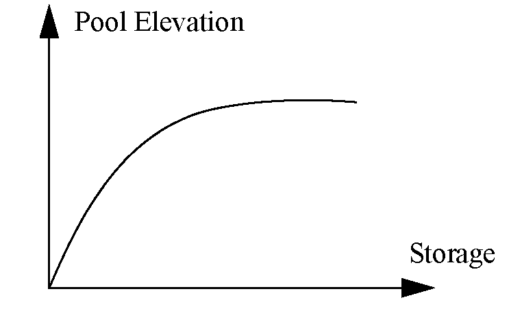 Defined by: Numerical 2-D Approximation in terms of Storage, based upon the Elevation Volume Table. The Pool Elevation LP Param table values are used as approximation points indexing the Elevation Volume Table. The Elevation Volume Table should have increasing values of Pool Elevation and Storage. Storage is required to be a concave function of Pool Elevation. The preferred order of approximation is substitution, piece-wise, tangent, two-point line.