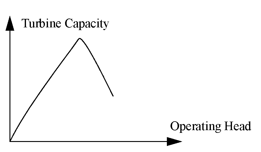 Turbine capacity operating head relationship. Not drawn to scale.
