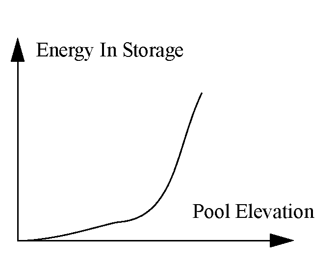 Defined by: Numerical 2-D Approximation in terms of Pool Elevation, based upon the Energy In Storage Table. The Energy In Storage LP Param table values are used as approximation points indexing the Energy In Storage Table. The Energy In Storage Table should have increasing values of Pool Elevation and Energy In Storage. Energy In Storage is required to be a convex function of Pool Elevation. The preferred order of approximation is substitution, piece-wise, tangent, two-point line.