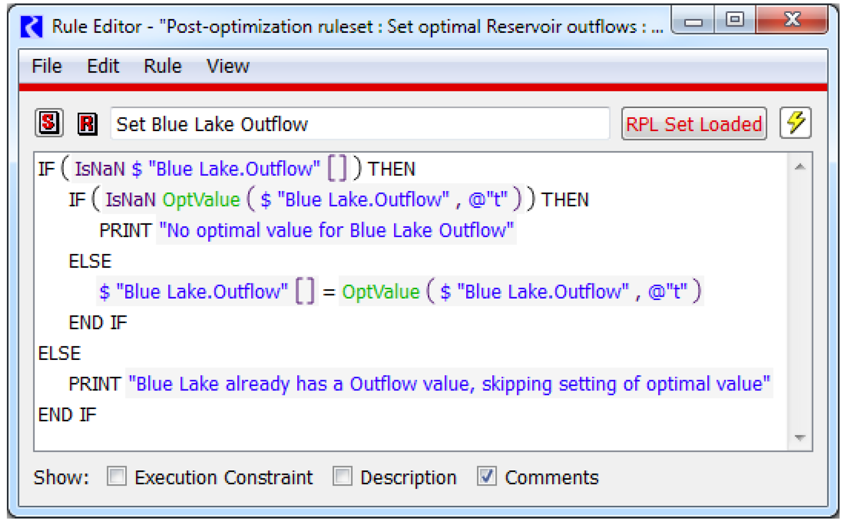 The automatically generated ruleset contains two policy groups. The first group (higher priority) is called “Set optimal Reservoir outflows.” The rules in this group set Reservoir.Outflow to the value from the Optimization solution by calling the OptValue() function. There is one rule for each reservoir, and they are ordered topologically. Specifically, the low to high priority order of rules corresponds to an upstream to downstream ordering of the associated reservoirs. Thus when using the default agenda order (...3,2,1), this causes the reservoirs to solve upstream to downstream.