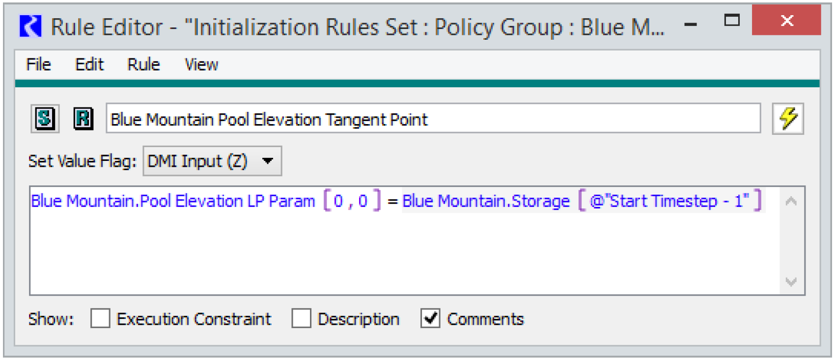 In some cases, it might make sense to set the approximation points based on the specific run conditions. For example, for a reservoir that has a large seasonal variation in Pool Elevation, it might not be possible to set Tangent and Line approximation points in the Pool Elevation LP Param table or an Operating Head point in the Power LP Param table (when using the Independent Linearizations method in the Optimization Power category) that will result in sufficiently small approximation error across all conditions. In these cases, initialization rules can be used to set the approximation points such that the approximation error will be small for the expected operating range of the given run but would be large if operating in a different range in another season. Figure 3.3 is an example initialization rule that sets the Pool Elevation LP Param Tangent point equal to the initial Storage for the run.