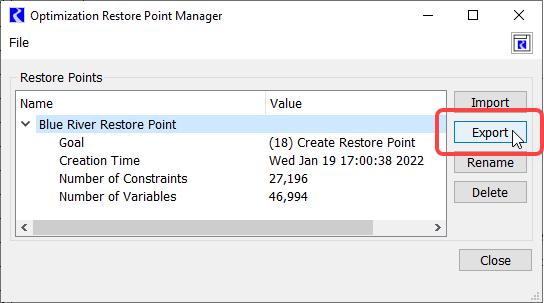Optimization Restore Points are not saved in the model file. To preserve a Restore Point for use when the model is reloaded or in another RiverWare session, it must be exported to a file and then imported into the model in which it will be used. (For instructions to import a Restore Point, see Import a Restore Point.) Restore Points can be exported to a file in three ways.