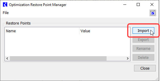Note:  In order to use a Restore Point in an optimization run, the Restore Point must be imported before starting the Optimization controller.