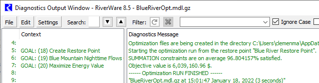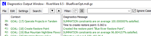 When the Optimization controller starts, it will skip all goals prior to the goal with the specified Restore Point. At the Restore Point goal, it will re-instate the optimization problem using the Restore Point then solve all remaining goals as normal. The diagnostic output will include a message indicating that the run started with the Restore Point. In the image below, the diagnostic message indicates, that goals 1-17 were skipped, and the run started by re-instating the Blue River Restore Point at priority 18. It then solved priorities 19 and 20 as normal.