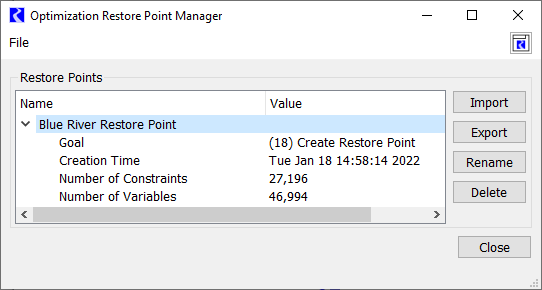Note:  The importing of a Restore Point from a file can take a noticeable amount of time, particularly for large optimization models with numerous timesteps and a large number of optimization goals, in other words, when the optimization problem represented by the Restore Point has a large number of constraints and variables. However, the time to export and import a Restore Point is generally much less than the time required to repeat the portion of the optimization run represented by the Restore Point.