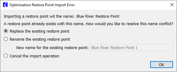 – Rename the existing Restore Point so that it can be preserved - RiverWare will give the existing Restore Point a new, default name; the Restore Point being imported will maintain its name from the file.