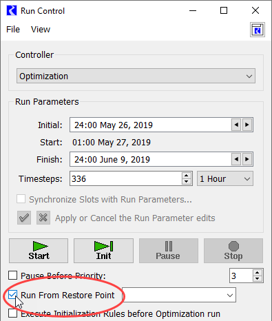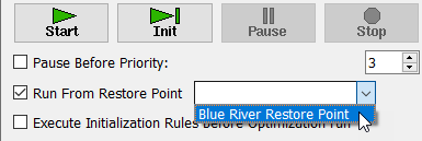 Use of a Restore Point as an advanced start for an optimization run can be specified either from the Run Control dialog or from the Set Controller script action.