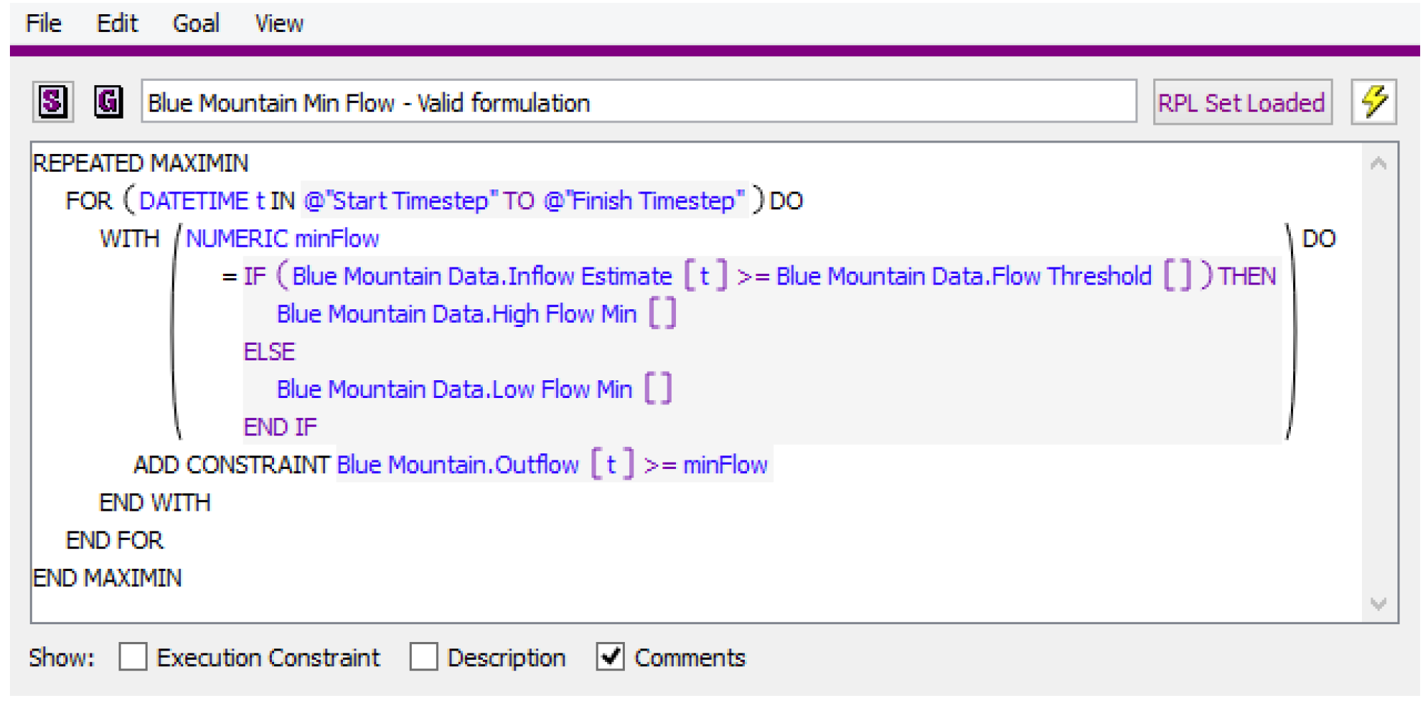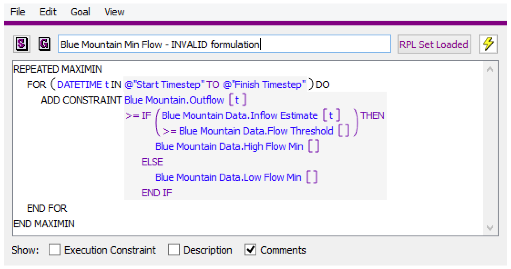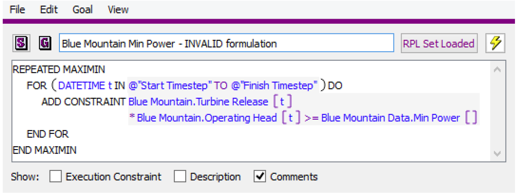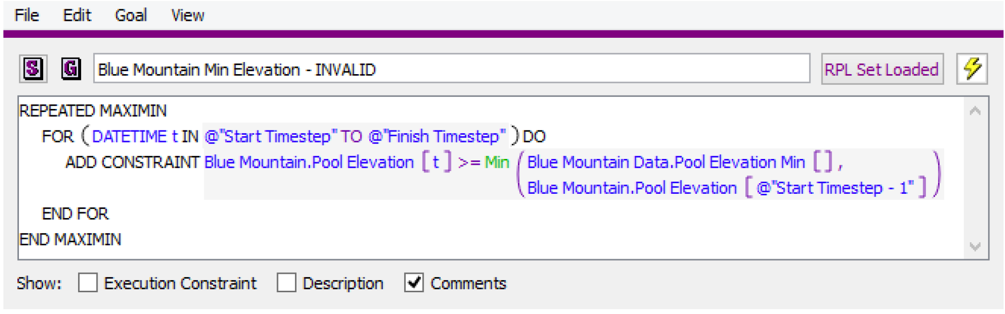 Figure 3.9 contains a RPL predefined function, Min, within the constraint statement and would cause the run to terminate. User-defined functions can be used within constraint statements as long as the functions do not contain nonlinear functions of variables.