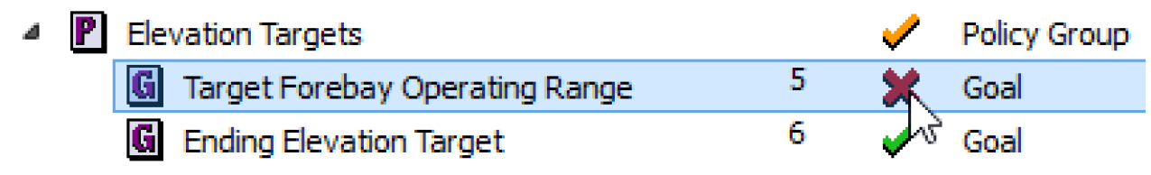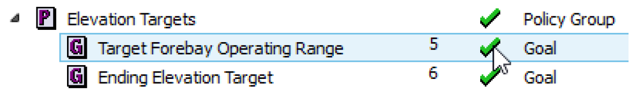 The Target Forebay Operating Range goal is at a lower priority. This suggests that ideally you would like to keep the forebays (Pool Elevation) within some specified range, but you are not going to violate either of the flow requirements in goals 3 and 4 to do so.