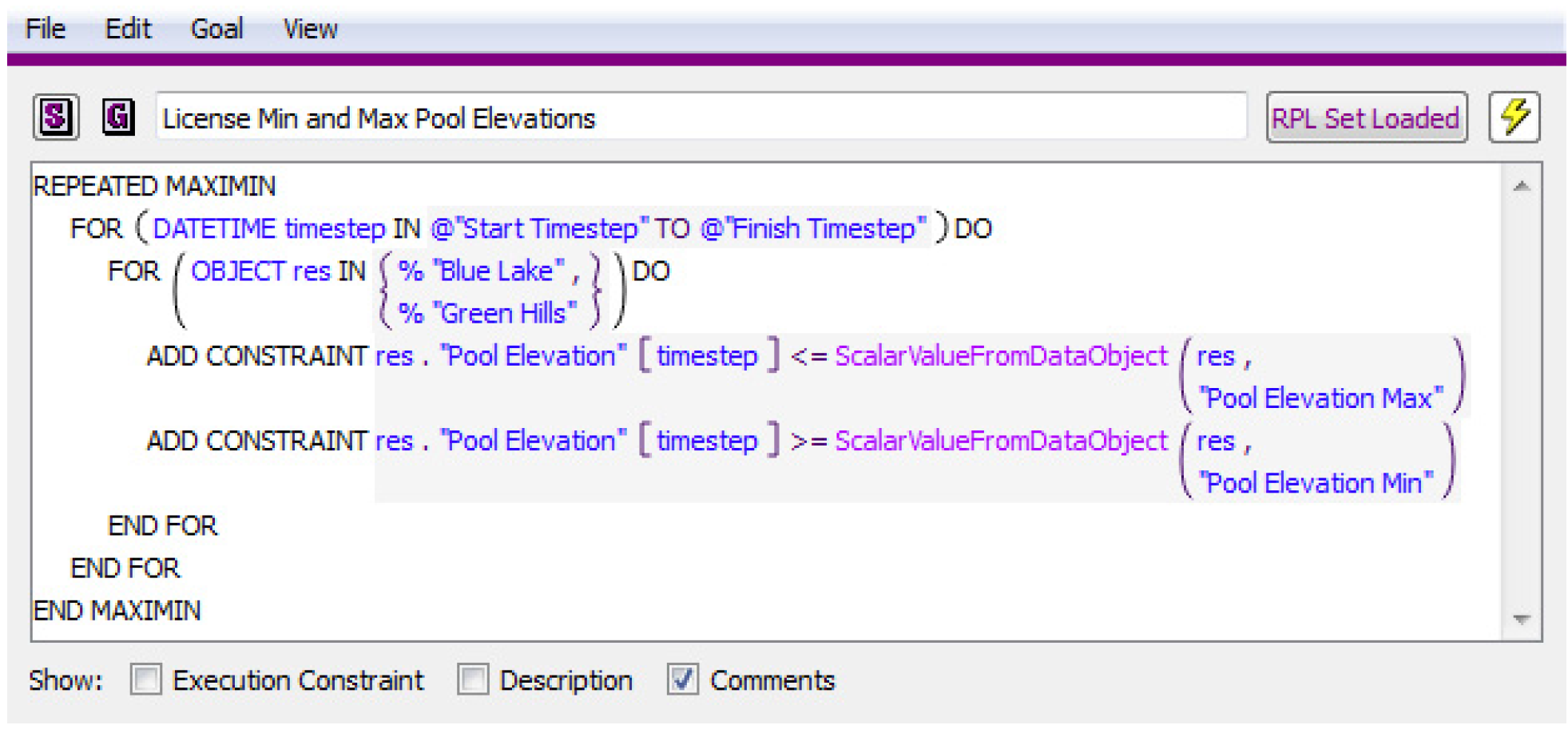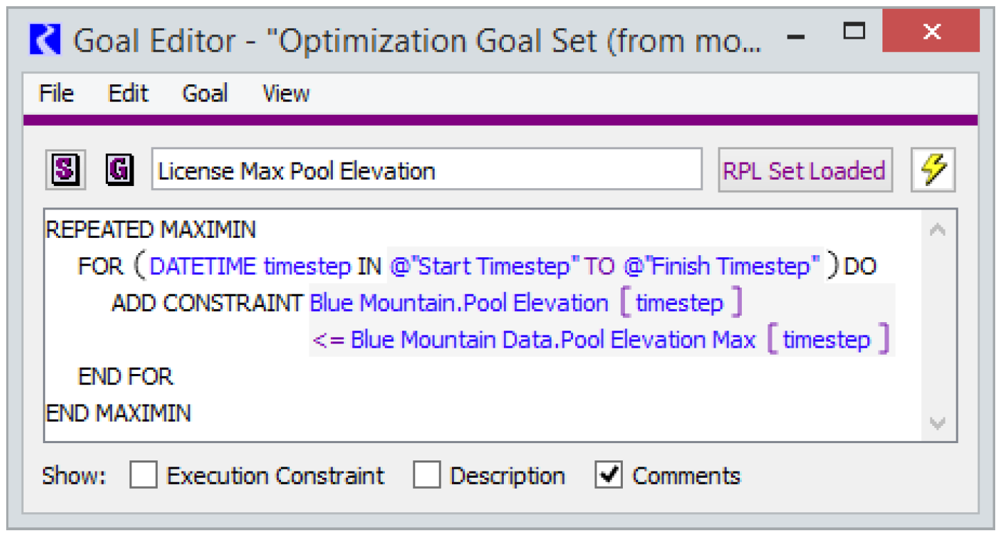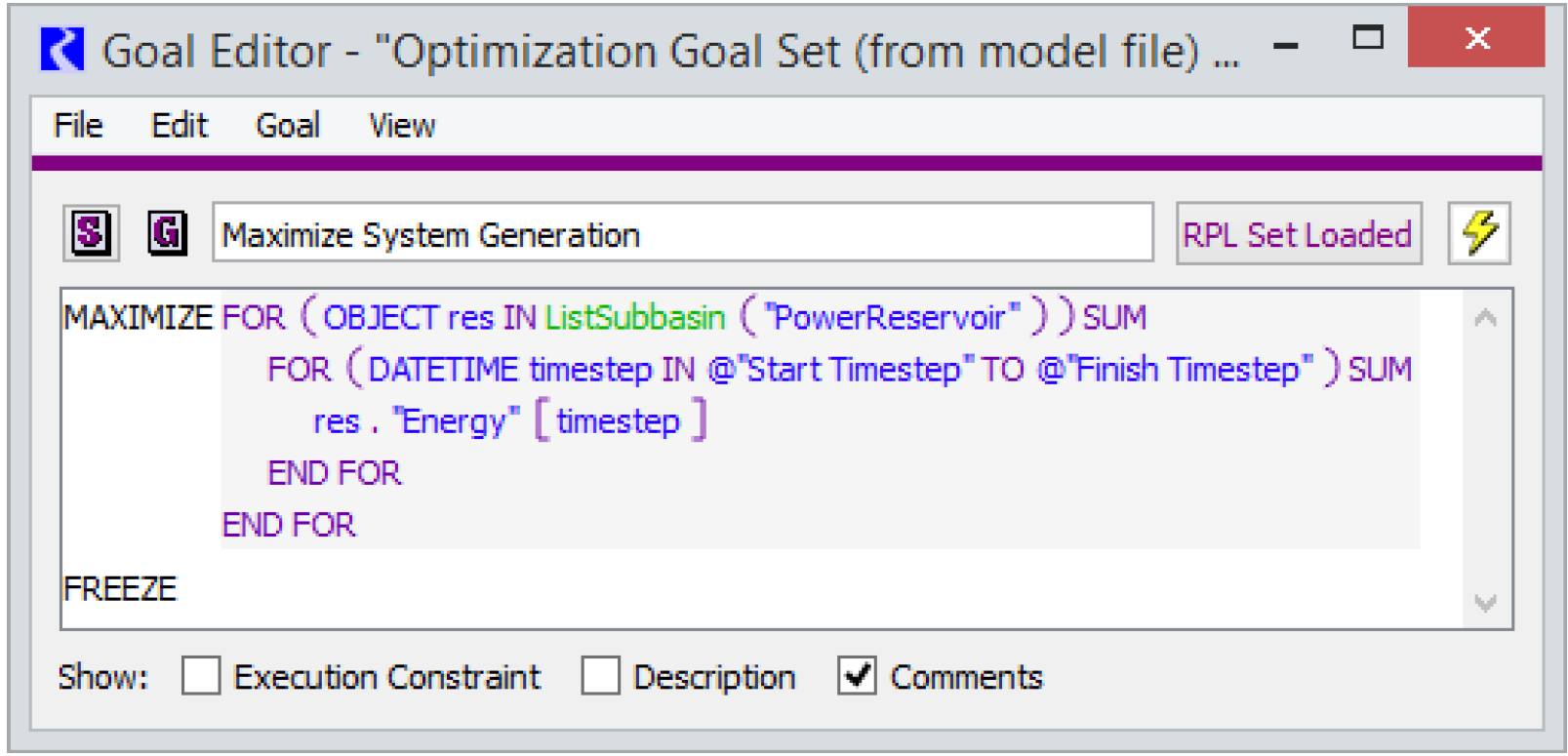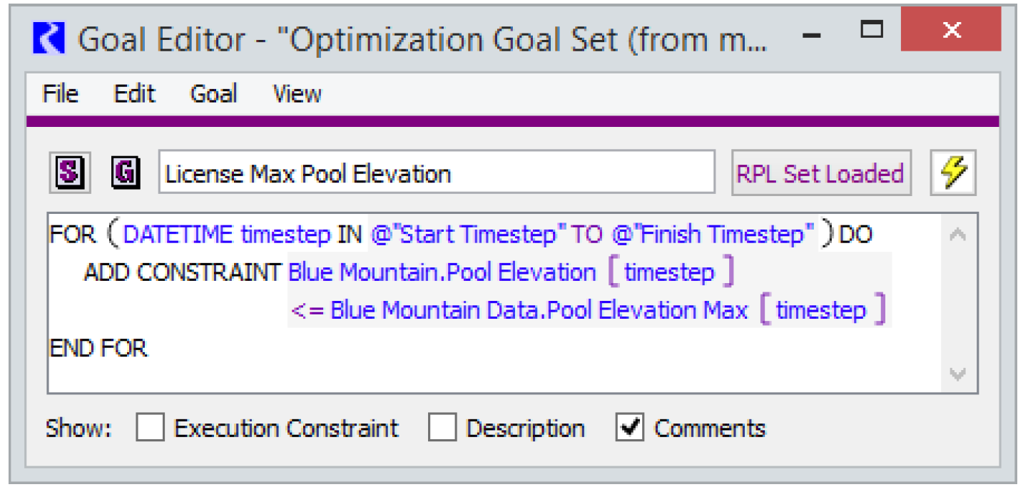 The operating policy of a basin is expressed in a RPL Optimization Goal Set. This section describes the components of the Optimization Goal Set. An Optimization Goal Set uses much of the same syntax as a Rulebased Simulation ruleset. See
