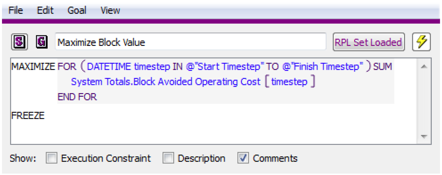 Note: A Freeze statement must be added at the end of an Objective statement in order to freeze the objective value. Otherwise the objective value from the goal will not necessarily be maintained at lower priorities.