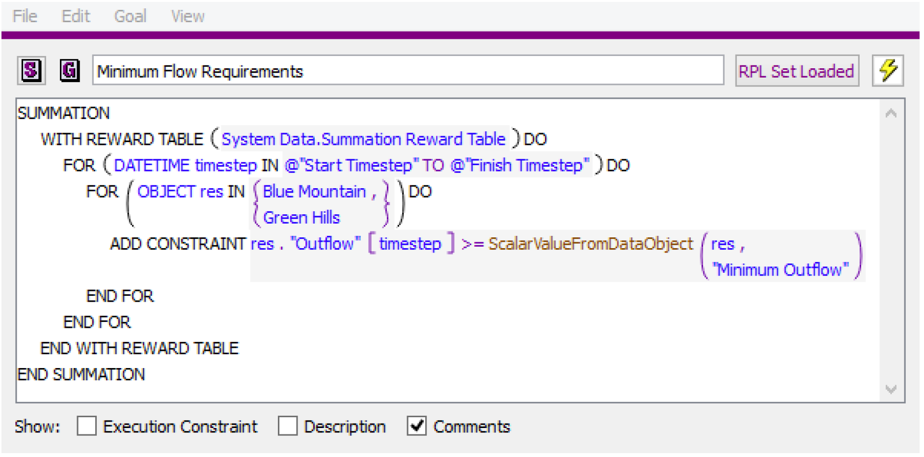 The potential downside of this approach is that it can tend to place all of the deviation on one or just a few variables. For example, if a minimum flow constraint cannot be met for every timestep, it might minimize the total violation by satisfying the constraint at all but one timestep and putting a very large violation on that one timestep. Typically, this is not the preferred solution in a water resources context. The concentration of large violations when using a Summation Soft Constraint Set can be prevented by applying a With Reward Table statement within the Summation. See