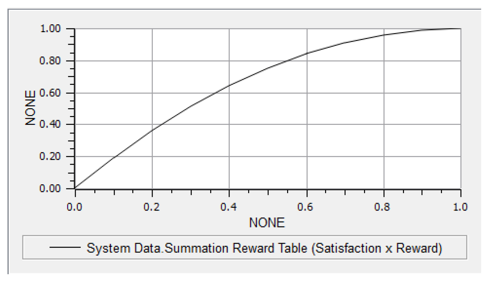 The reward table slot must have two columns with units of NONE. The first column contains satisfaction values. The second column contains the corresponding reward values. The values in both columns must be between 0 and 1. If the user does not include rows for a satisfaction of 0 and 1, RiverWare will add these rows internally when processing the piecewise reward function with values of 0 and 1 used for the reward. The reward table must be concave. (Reward must be a concave function of Satisfaction.)
