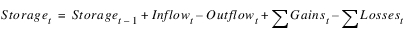 This is the defining constraint for the Storage, Inflow and Outflow variables at time t. RiverWare determines which individual variables to include in Gains and Losses depending on the method selection on the reservoir. For example, Evaporation could be an additional loss variable in the mass balance constraint. For a reach, the defining physical constraints are determined by the selected routing method.