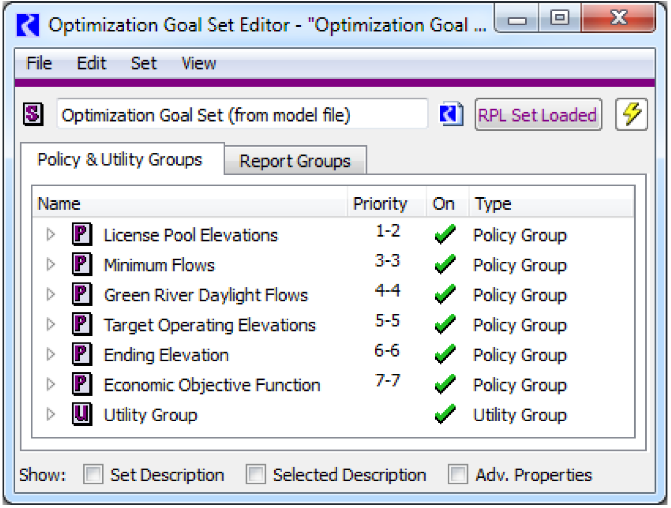 The policy of a river basin is expressed by the user in an Optimization Goal Set. Like rulesets in Rulebased Simulation, the Goal Set is formulated in RiverWare Policy Language (RPL). Also similarly to a ruleset, the goals in a Goal Set are expressed in priority order. For example, license minimum and maximum pool elevation constraints for reservoirs might be the highest priority goal. These are goals that would essentially never be violated. Lower priority goals might include target operating elevation range constraints. These would represent elevations that should be maintained under normal operating conditions but might be exceeded in extreme scenarios such as flood control operations. Goals with a Minimize or Maximize objective tend to be at the lowest priority, after all policy constraints have been satisfied to the greatest extent possible.