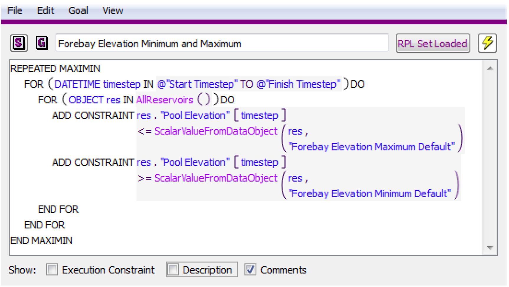 A user has the flexibility to formulate any type of constraint or objective they desire as long as the expressions are linear combinations of variables. Constraints can include average values over multiple timesteps or summations over multiple slots on multiple objects. Similar constraints for multiple objects can be grouped into a single constraint statement. For example, a single maximum elevation constraint can be added for all reservoirs in a model by creating a loop over a list of reservoirs and referencing the maximum elevations from a data object slot corresponding to each reservoir.