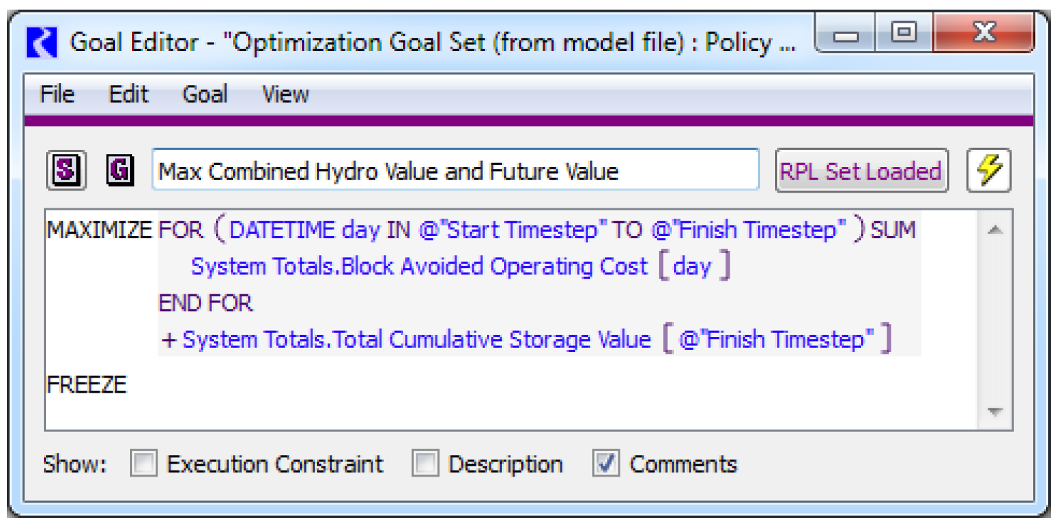 Objectives allow for a trade-off between present value and future value. An objective might include the combined value of the hydropower generated during the run and the value of energy in storage (future potential value) at the end of the run.