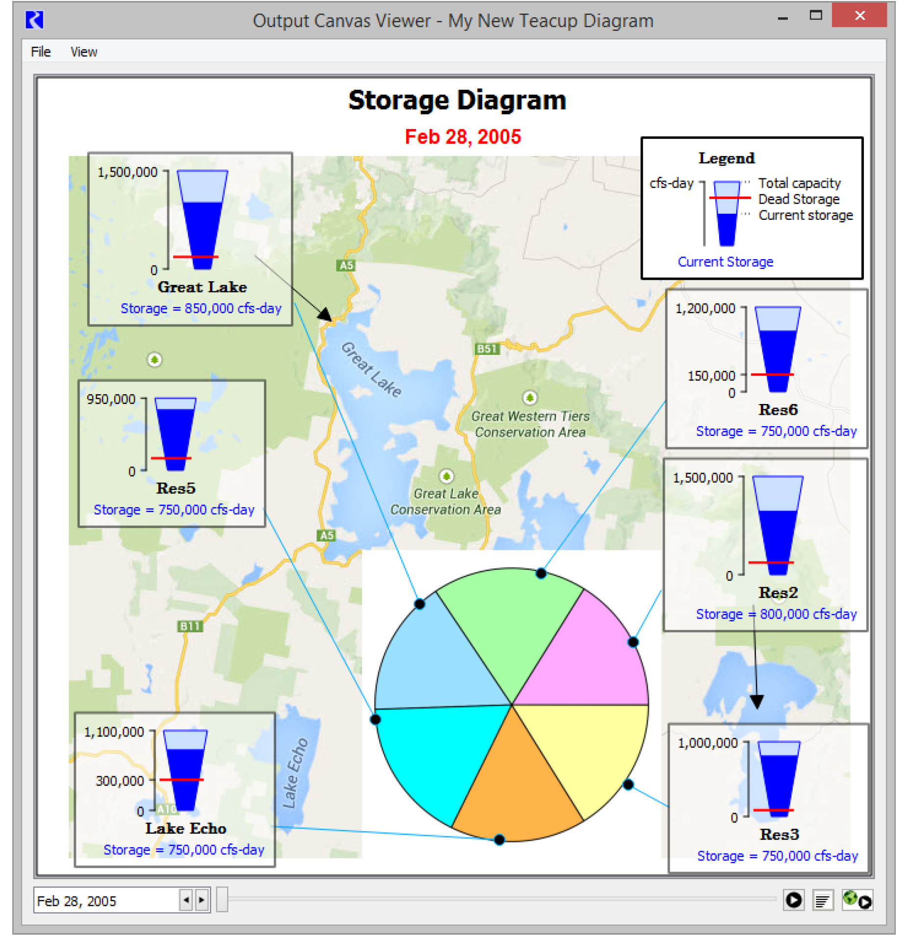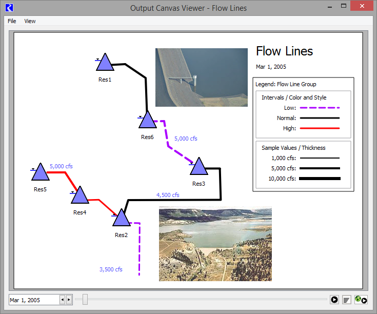 Also, create Flow Lines, which often represent the flow of water in a river network. Configure the flow lines to change thickness based on the flow compared to other values in a group, and change color and line type as the flow crosses thresholds defined for each particular flow line or on each object. See Figure 6.2.