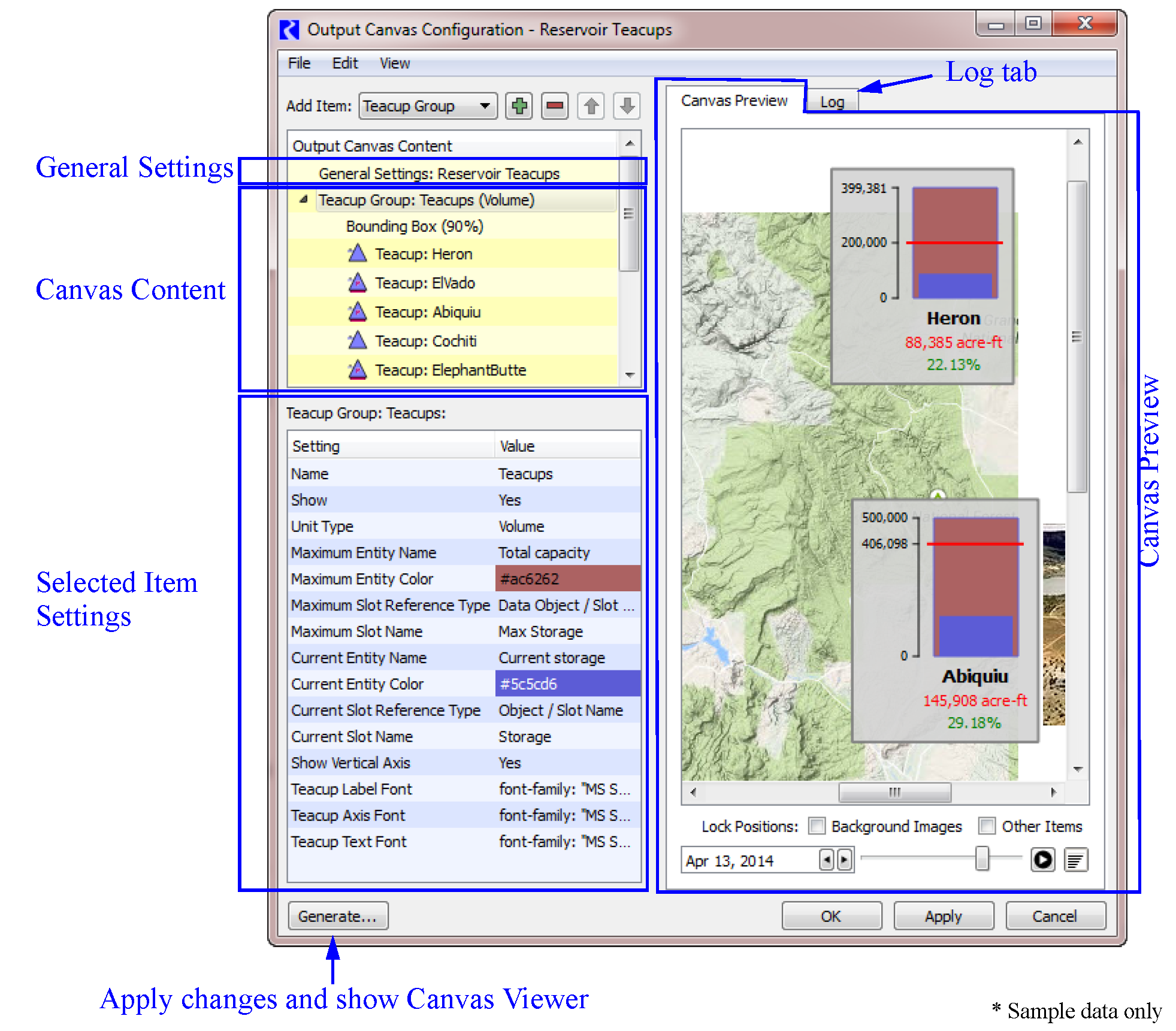 The Output Canvas configuration dialog allows you to create or change a canvas. It consists of the following areas, as shown in Figure 6.3.