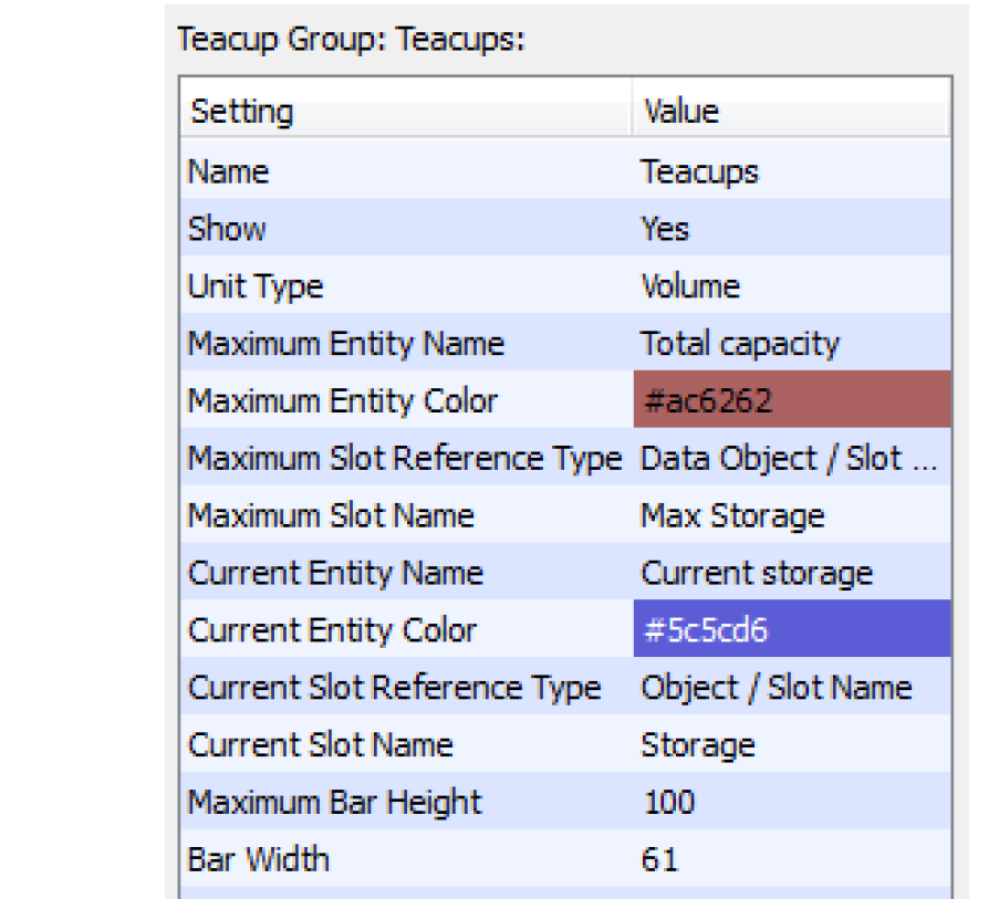 A Teacup Legend is part of a Teacup Group and provides a key to the teacups. The maximum value, the current value, markers, text and the units are shown in the legend.