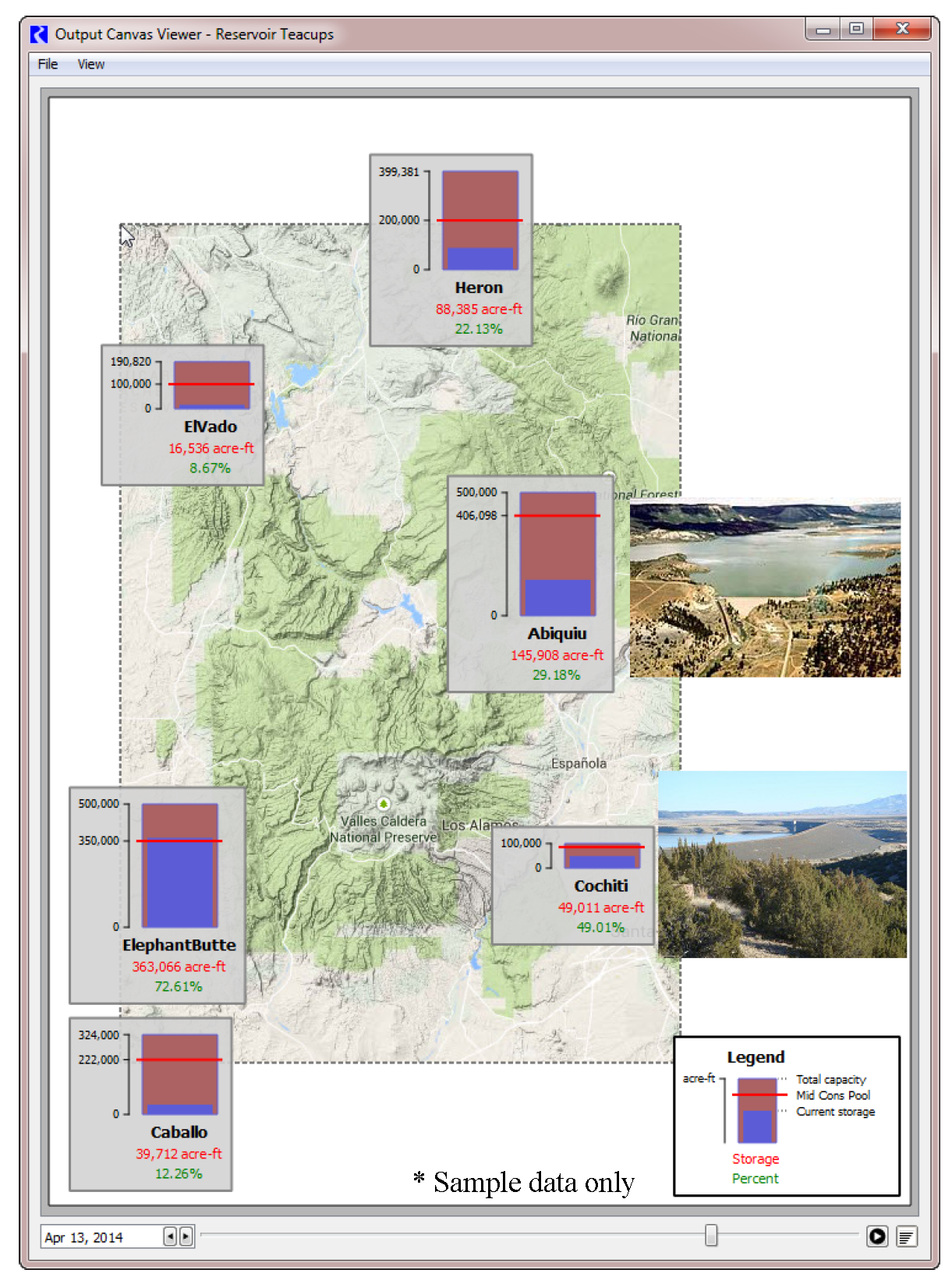 The Output Canvas Viewer dialog is shown when the Output Canvas is generated. You can generate from the Output Manager or directly from the Output Canvas Configuration by selecting Generate. On the Viewer, the position of all items is locked and cannot be changed. Animation controls at the bottom allow you to manually or automatically scroll through the run timesteps as described in the next section.