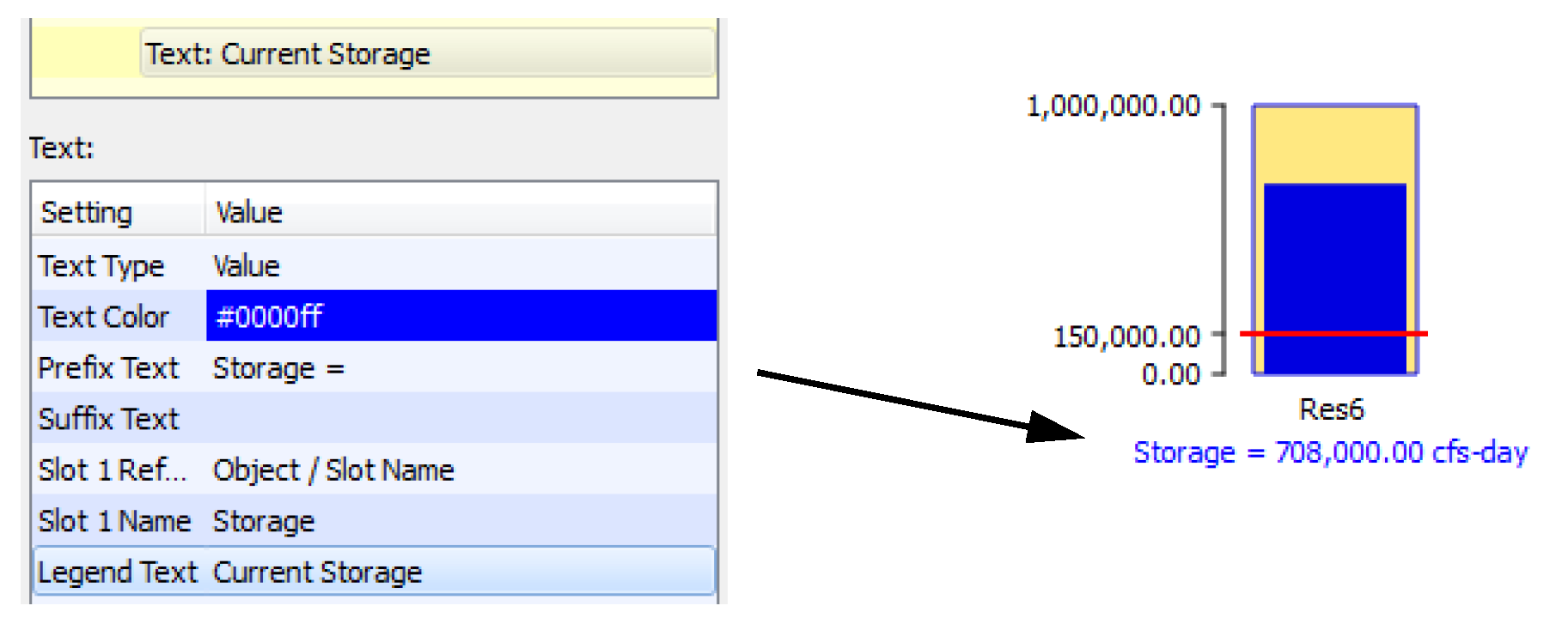 13. In the settings, specify the type of text. For this example, we will add text showing the current storage. Select Value for the Text Type setting. Specify the prefix, suffix, slot reference, slot name, and Legend Text.