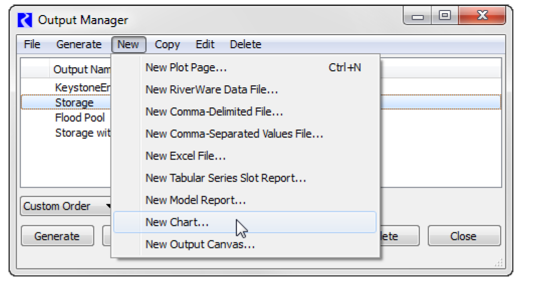 Chart configurations are Output Devices (i.e. like a Plot Page, RiverWare Data File, Comma-Delimited File or Excel File).Chart configurations are created within the Output Manager dialog.