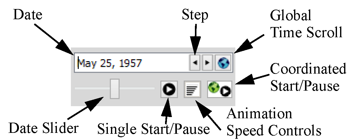 If the timestep controls have been added in the configuration, the controls appears under the chart as shown in Figure 5.9. These controls allow the chart display to be stepped forward and backward through the timesteps. Select Start to animate through time. Use the date slider to see where you are in time and the animation speed controls to change the speed (seconds per frame). Select Coordinated Start/Pause to animate all opened charts and Output Canvas at the same time. When in coordinated animation mode, you can stop all animations from any dialog. But, from the dialog in which you started the global animation, you can select the single pause to pause all dialogs. Then use the slider to move the date for all dialogs globally. Select Coordinated Start/Pause to end the coordinated animation.