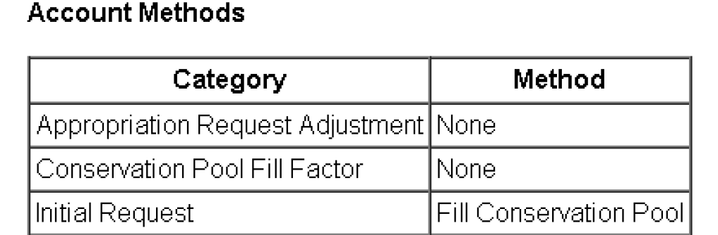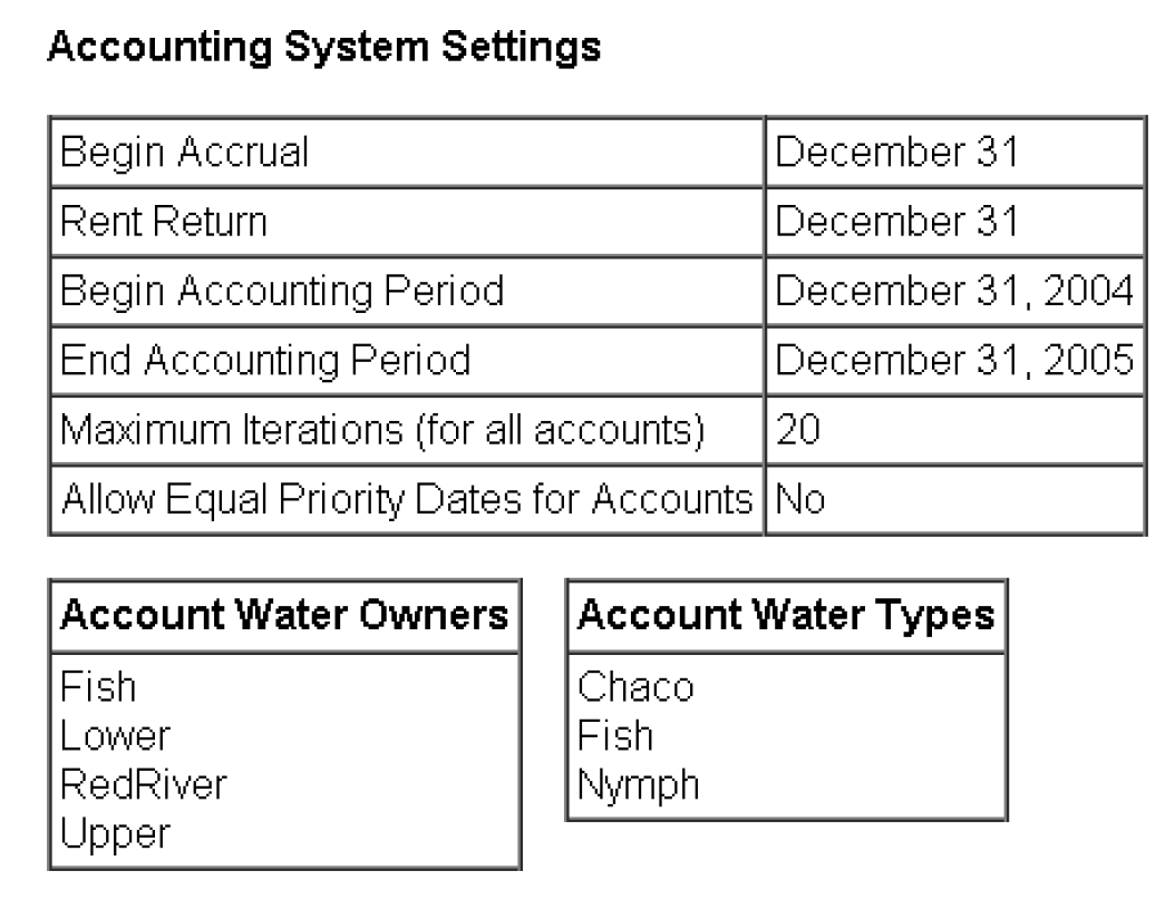 Lists the information on the accounting system including range, accrual date, water types, owners, etc. This is the information shown in the Accounting, then Account System Configuration dialog.