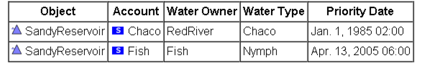 Presents a table with a list of accounts (often those for a single simulation object) and optional columns for several account attributes including type, water type, water owner, and priority date