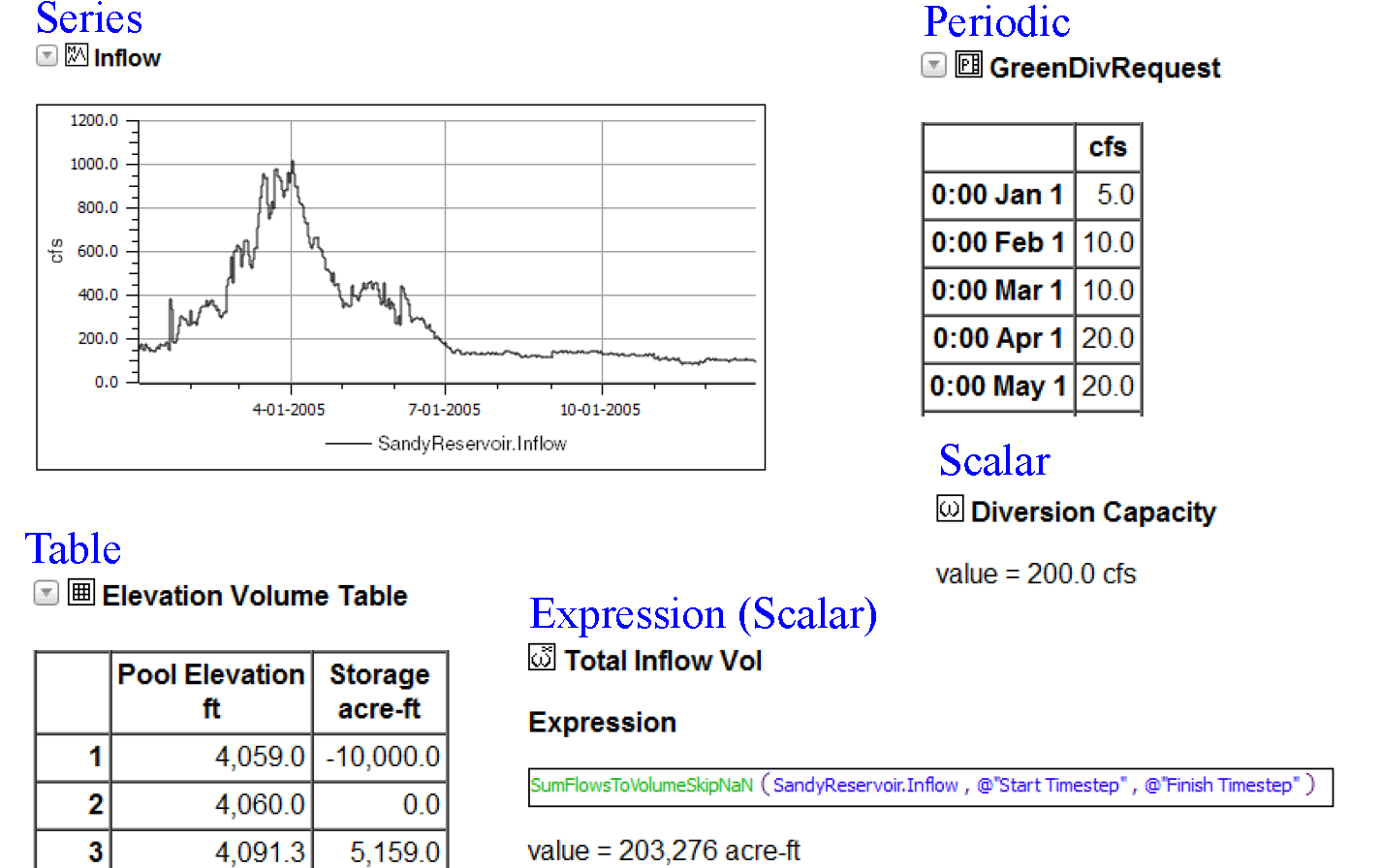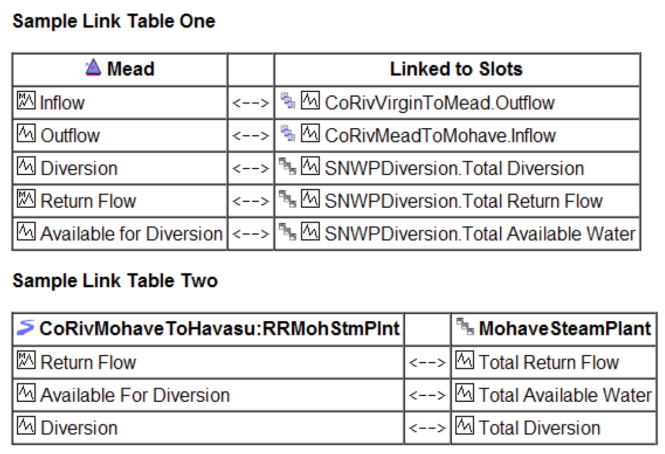 Shows a slot’s name, description, and values. For, table, periodic and scalar slots, the values are shown. For series slots, a plot of the time series is shown. For Expression Slots, the RPL expression is shown along with a plot (series) or value (scalar)