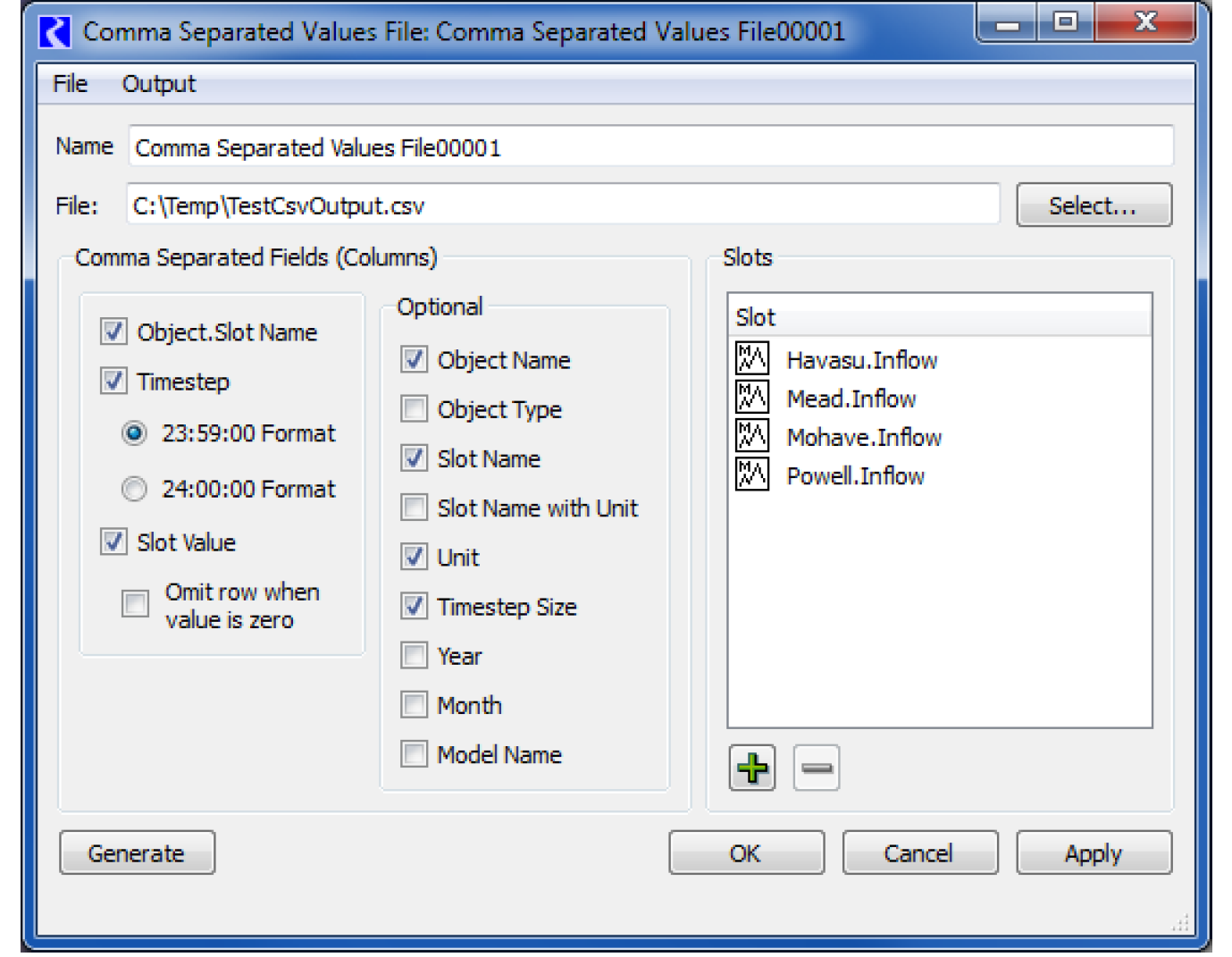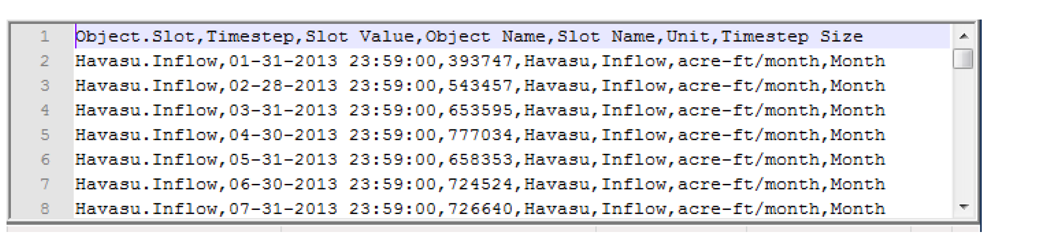 Following are the steps to create a Comma-separated Values (CSV) file. The CSV file has one line per timestep and includes many other fields, some automatically and some optionally. This CSV format is designed to be used in Excel or the Tableau software.