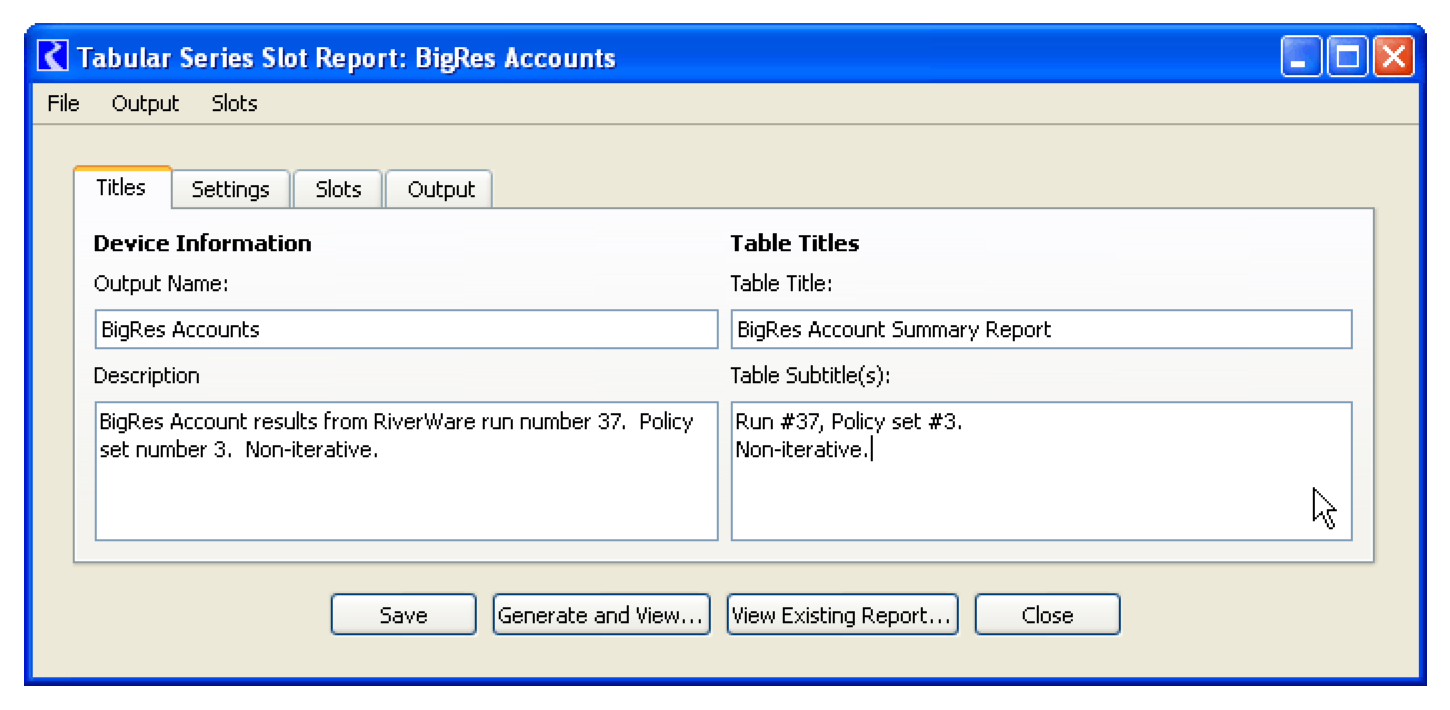 Tabular Series Slot Report is an output device which generates a plain text or HTML document showing, in a table or multiple tables, series values for a set of slots. See
