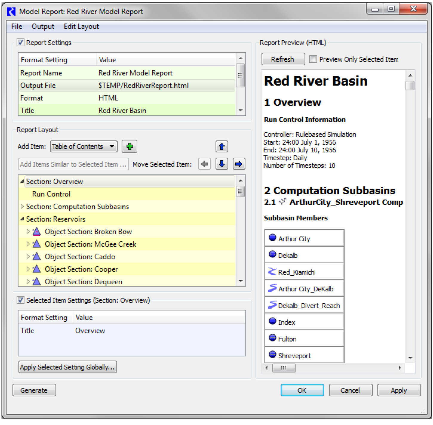 Model Report is an output device which generates an HTML document showing information about a model including slots, selected methods, run range, and subbasin membership. See
