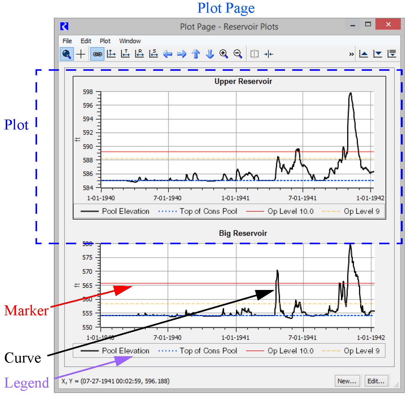 The a Plot consists of a set of X and Y axes (one or two of each). The plot contains Curves, Markers and a Legend. It also has a configurable grid, background color and title.