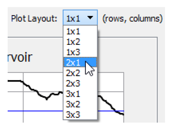 From either of these layout menus, you can choose the number of plots that appear in the Plot Page. You may change the Plot Page from a 1X1 array of plots to as many as a 3X3 array. When the display size of the Plot Page dialog changes, the plots are automatically updated to occupy the new dialog size.