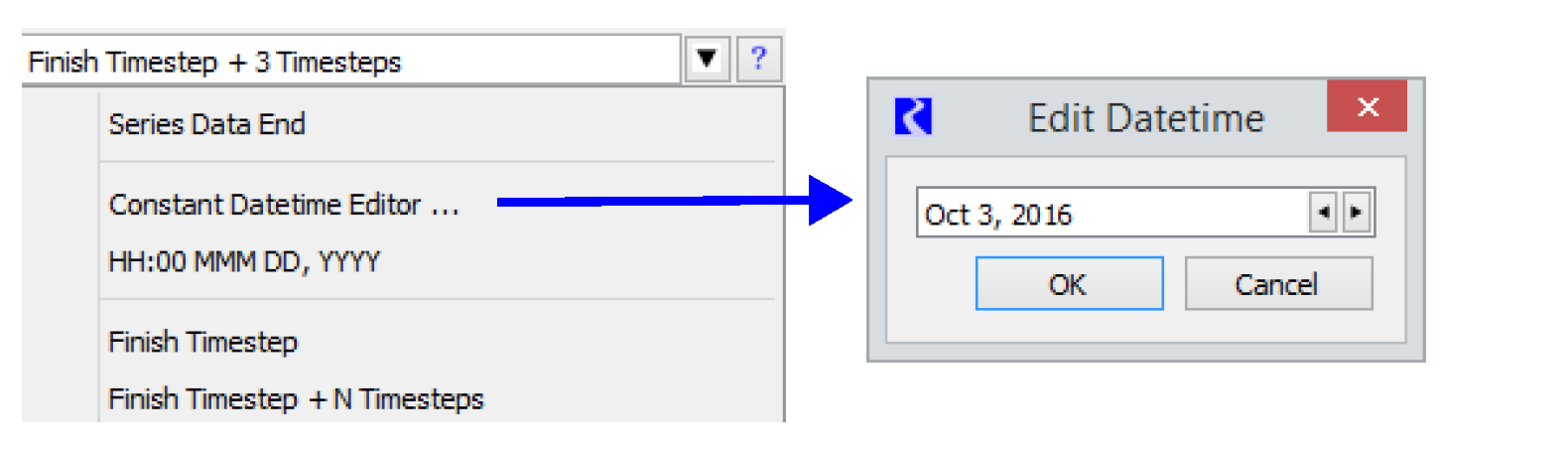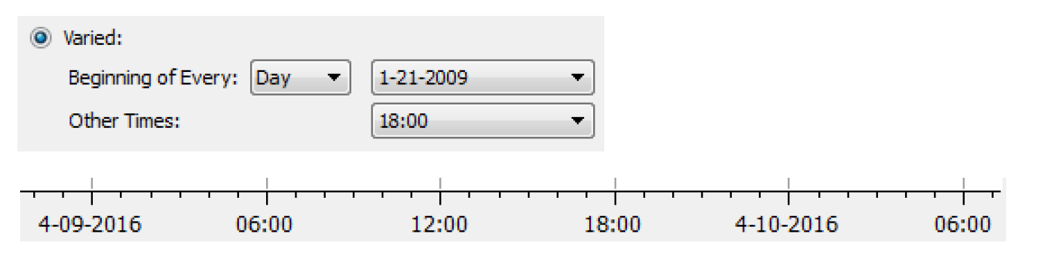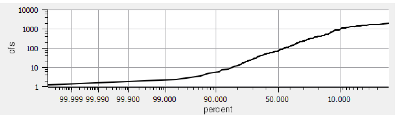 • Step Curve: Show horizontal lines to the left of each data point in the series. These interval values are then connected by vertical lines to create a step. A step curve is the default curve style for slots involving units of flow since flow is an average value over a timestep.