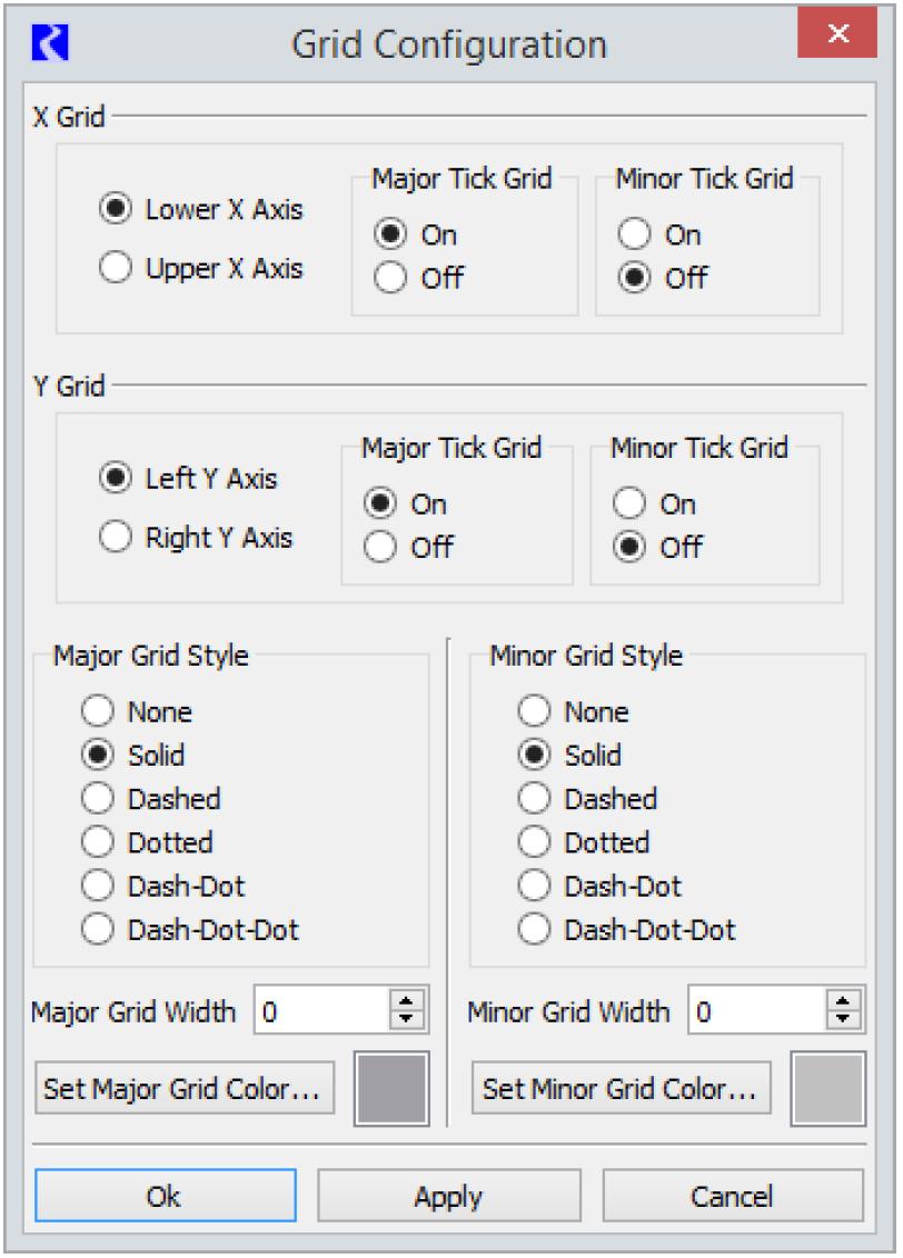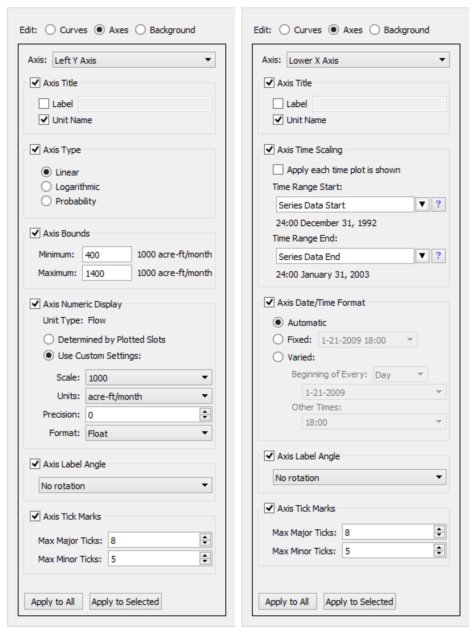 Use the Axis Configuration to control the appearance of the axes. First select the desired Left Y, Right Y, Lower X or Upper X axis. The configuration options are different for numeric data versus time series data. First described are common settings and then the settings that are unique for numeric axes, then below for time axes.