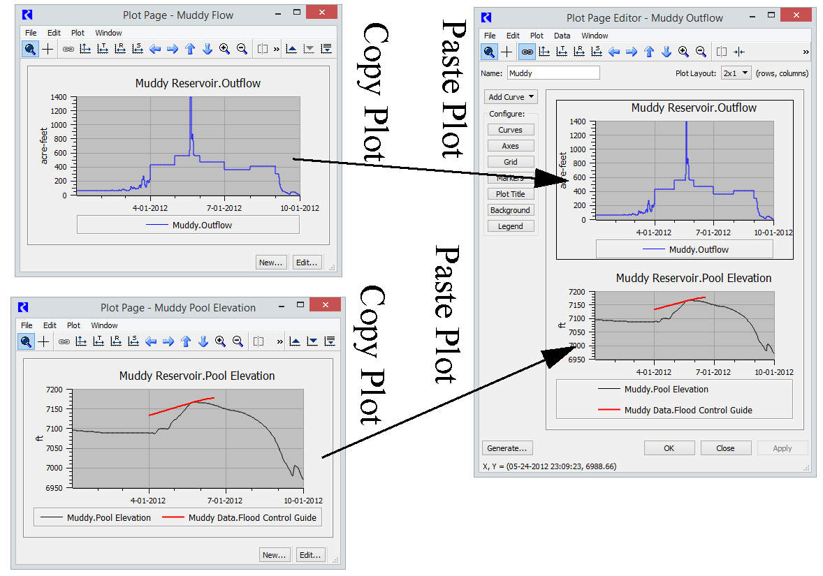 All configuration for a Plot Page is carried out in the Plot Page Editor. You can plot series slots, table slots, scalar slots, and periodic slots. Series slots can be plotted with time on the x-axis, or two series slots can be plotted against each other. Multiple curves can be plotted on the same plot (set of axes), and multiple plots can be shown in different panels of a Plot Page.