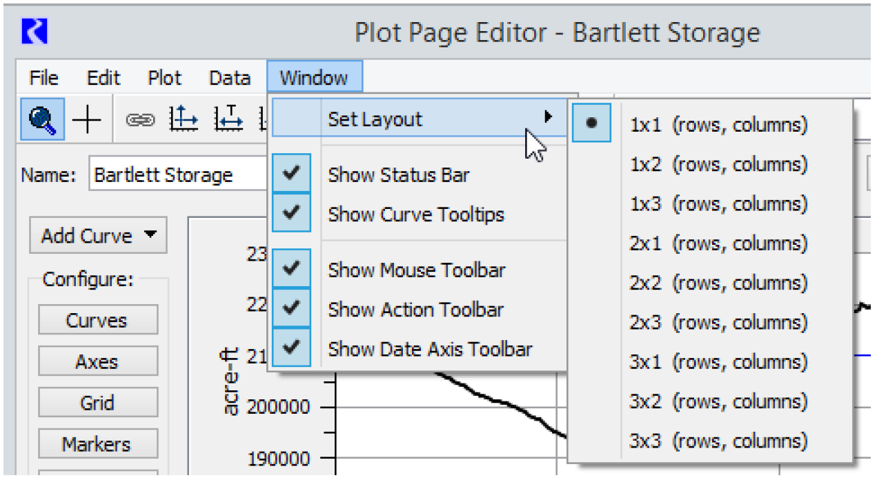 Plots can be added to a Plot Page in the Plot Page Editor by selecting Window, then Set Layout. Alternatively, select the Plot Layout dropdown menu near the top right of the Plot Page Editor.