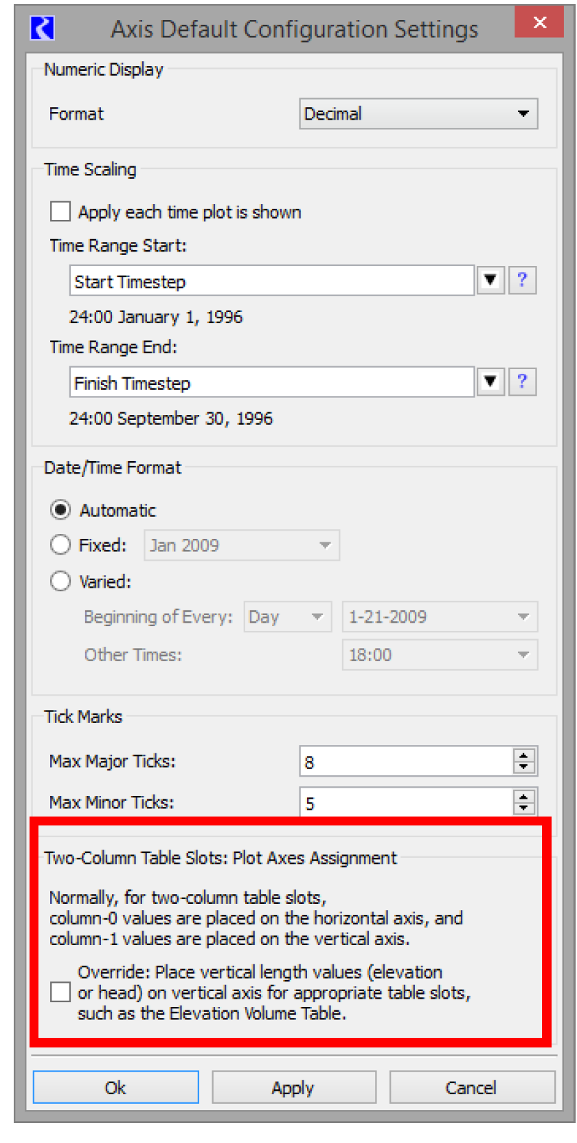 The automatic switching of plot axes is applied at the time of creation of the plot -- so changing the setting of this toggle does not effect plots already created and saved with a RiverWare model file.