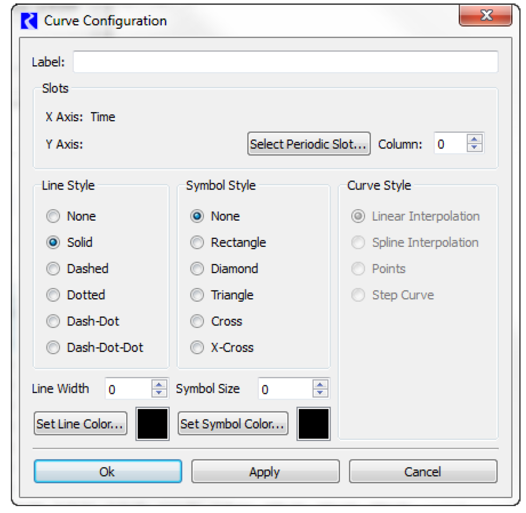 A periodic curve is used to plot a column of a periodic slot (y-axis) versus the time on the x-axis. The user is able to specify the column to plot. The curve is shown for whatever time range is plotted. If there are not other plots on the curve, it defaults to the run length. Select