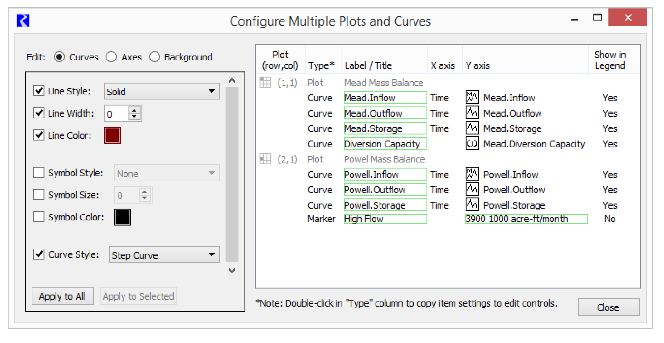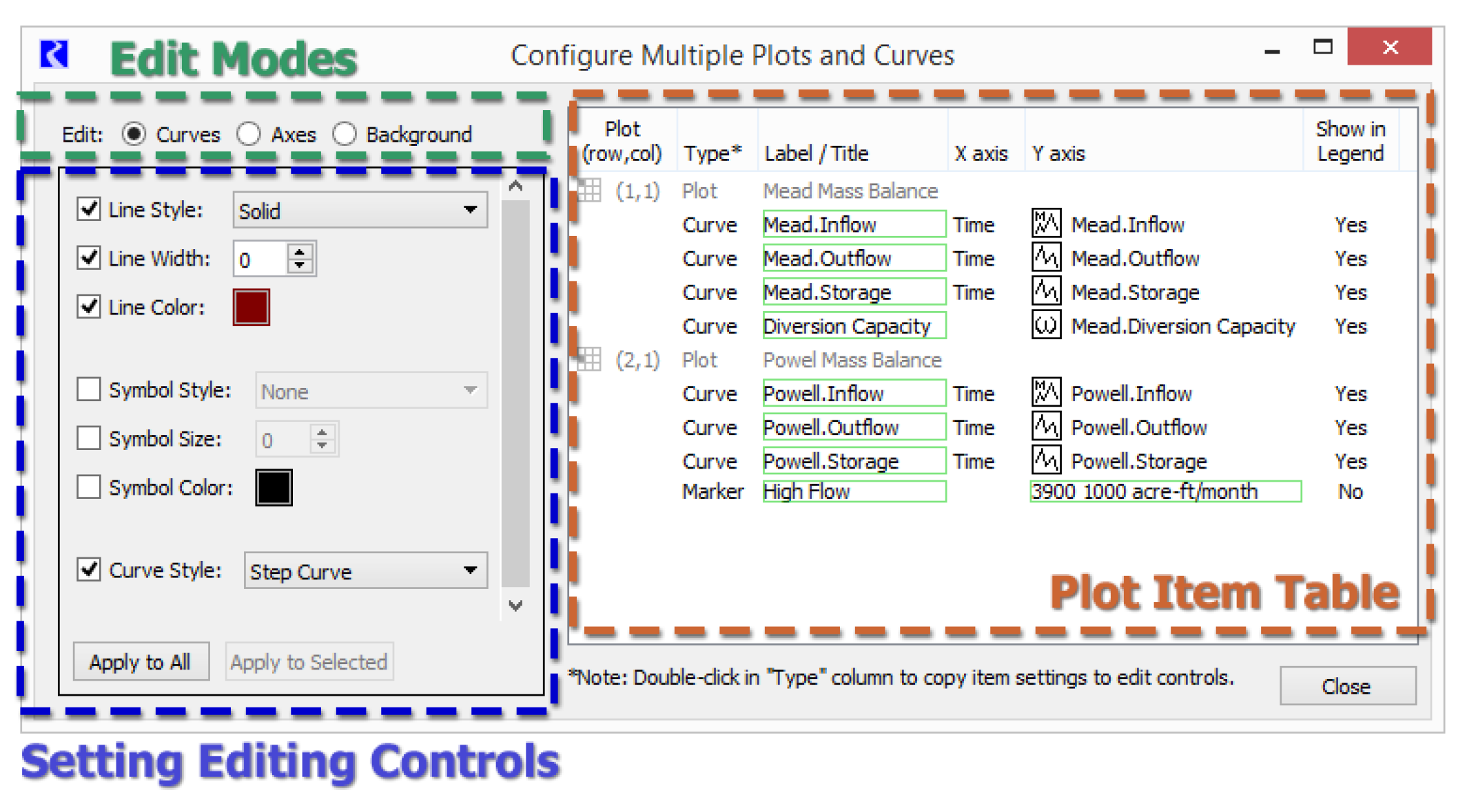In Curves edit mode, the curve and marker items within the plot item list are active. Double-clicking an item either starts an in-cell edit within the selected cell or copies that curve or marker's setting values to the editing controls panel. Curves' and markers' label text and markers' values can be directly edited.